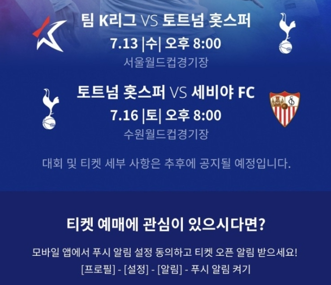 토트넘vs팀k리그 - 7월 13일 오후 8시 서울월드컵경기장