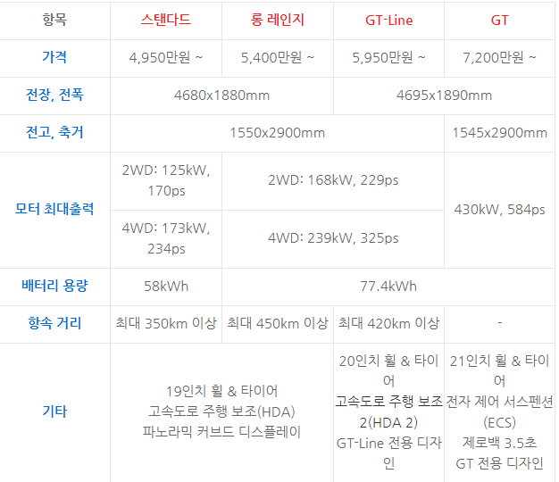 EV6 롱레인지와 GT라인은 최대 출력과 배터리 용량은 동일하지만,