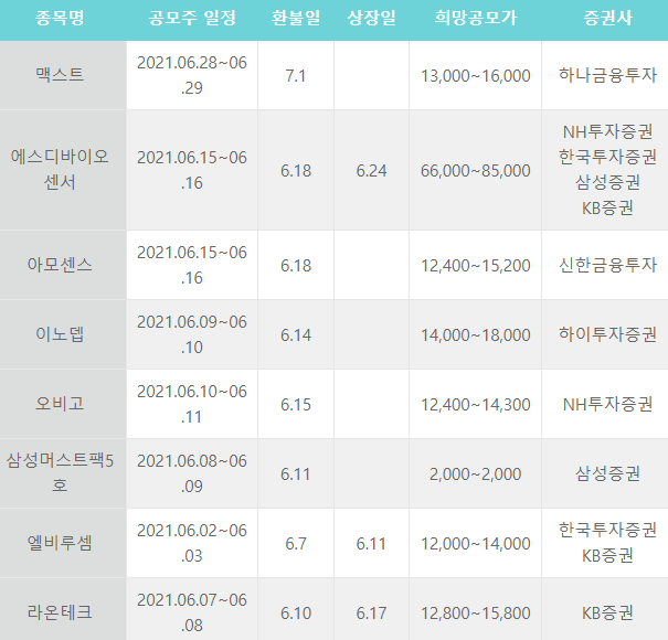 우선 6월 공모 예정 종목은 다음과 같습니다.