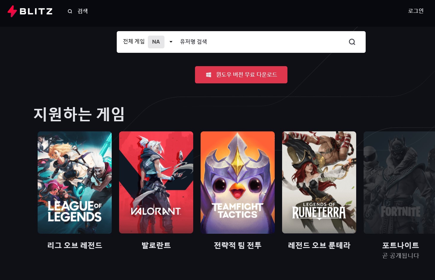 블리츠.gg 프로그램은 롤 이외에도 발로란트, TFT, 레전브오브룬테라 등도